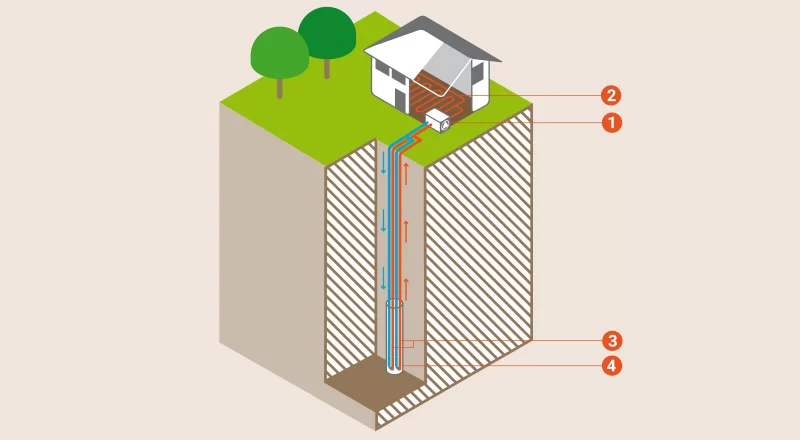 Une sonde géothermique est un tube en forme de U qui est inséré dans un trou de forage. Un liquide composé d'eau et d'antigel circule dans le tube. Ce liquide porteur extrait la chaleur souterraine et la rejette en haut dans le système de chauffage, via un échangeur de chaleur et une pompe thermique. Le liquide porteur refroidit retourne dans la surface où il absorbe à nouveau la chaleur du sol.